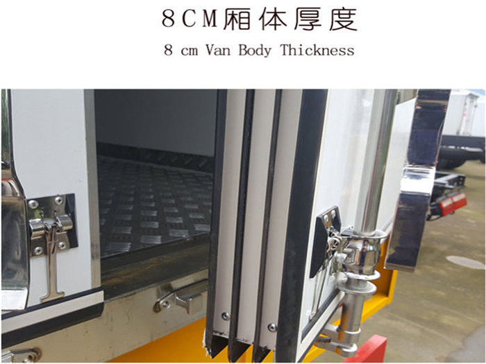 四、选装配置:导轨肉钩、T型通风槽、右侧开侧门、温度实时监控带打印装置、装海鲜厢体内部面料必须选装不锈钢制造、可选装12V-24V外接电源(车辆在停止时,厢体通过外接电源进行制冷)。